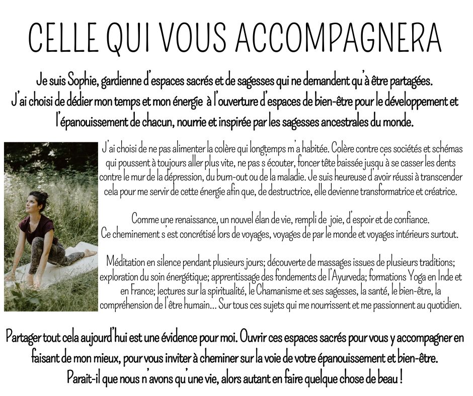 Depuis décembre 2022, je propose 2 à 3 fois par an un temps de retraite, de retour en soi, aux femmes désireuses de prendre soin d’elles. J’aime ces espaces, que j’appelle « sacrés ». Uniques, magiques, transformateurs et libérateurs. Mes outils pour accompagner ces femmes le temps de ces retraites sont issues des formations, transmissions et expériences qui ont fait de moi la femme que je suis aujourd’hui.