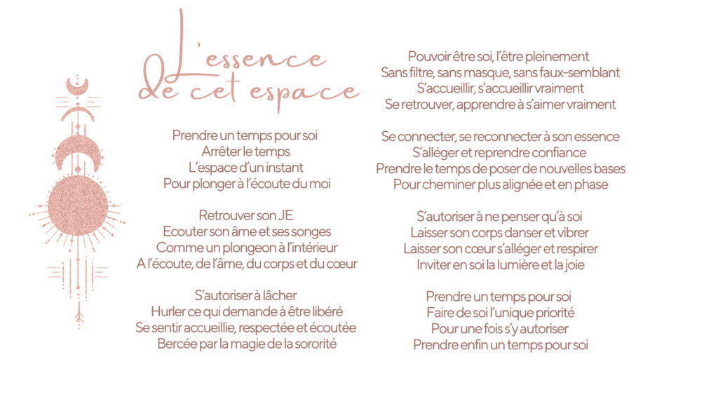 Pendant ces deux jours de retraite, je fais de mon mieux pour inviter chacune à goûter à la magie bienveillante de la sororité, pour se sentir à sa place et sentir que c’est ok de faire tomber les masques, juste être soi. Retrouver ce que c’est qu’être soi. Apprendre à se connaître un peu plus, apprendre à s’aimer tout simplement. Car nous aurons beau faire tout le cheminement possible, tout le développement personnel, tout le travail sur soi qu’il nous est possible de faire en une vie… Nous trouverons toujours sur notre chemin des personnes qui ne nous aimerons pas ou nous critiquerons. Alors peu importe le regard de l’autre. Ce qui importe c’est l’amour que l’on se porte.